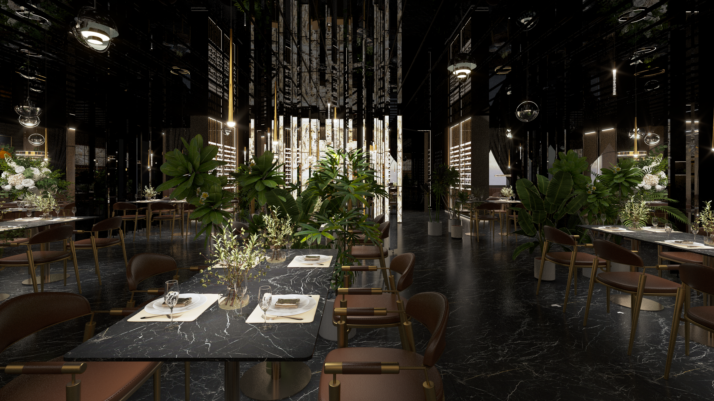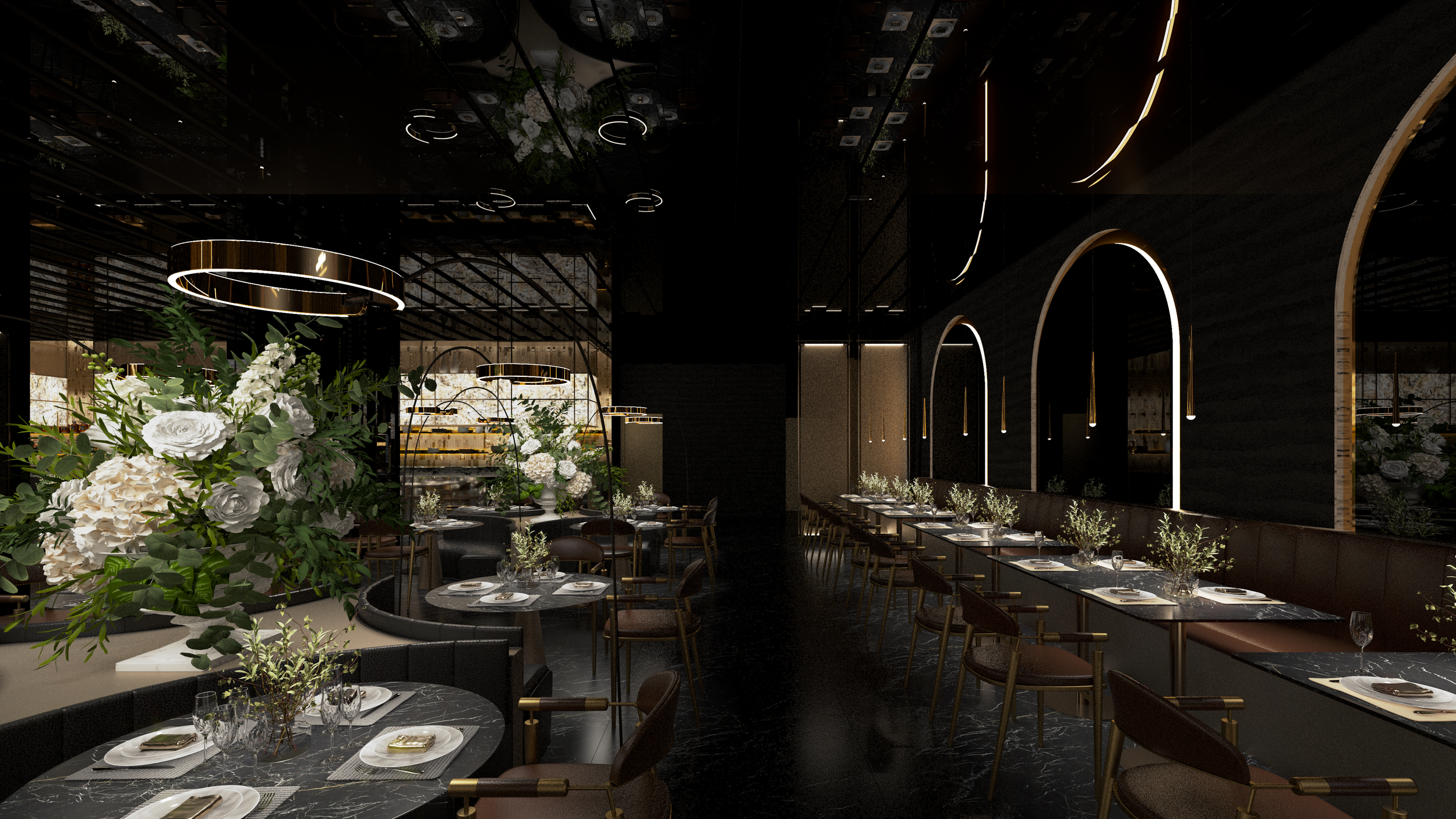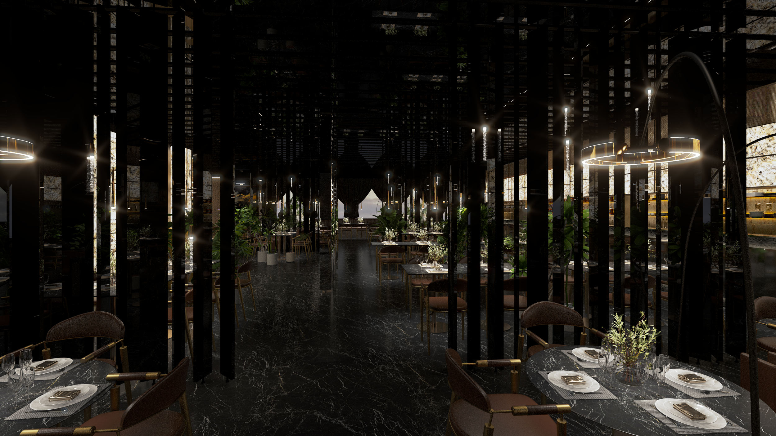 Questo ristorante buffet di sushi di alta gamma, situato nella città turistica costiera di Comacchio in Italia, si trova vicino al principale nodo di trasporto che collega le città vicine, circondato da meravigliose praterie costiere. Il cliente ha immaginato un palazzo a specchio su questo pittoresco prato, il cui design unico brilla sotto il sole, attirando ospiti da tutte le direzioni. Il design interno del ristorante utilizza metalli e specchi, completati da decorazioni dorate e materiali in pietra traslucida, creando un ambiente squisito ed elegante. Qui, offriamo una cucina raffinata e moderna che mescola elementi dell'Est e dell'Ovest, fornendo un luogo dove i commensali possono godere di un doppio banchetto di sapori e sensazioni visive