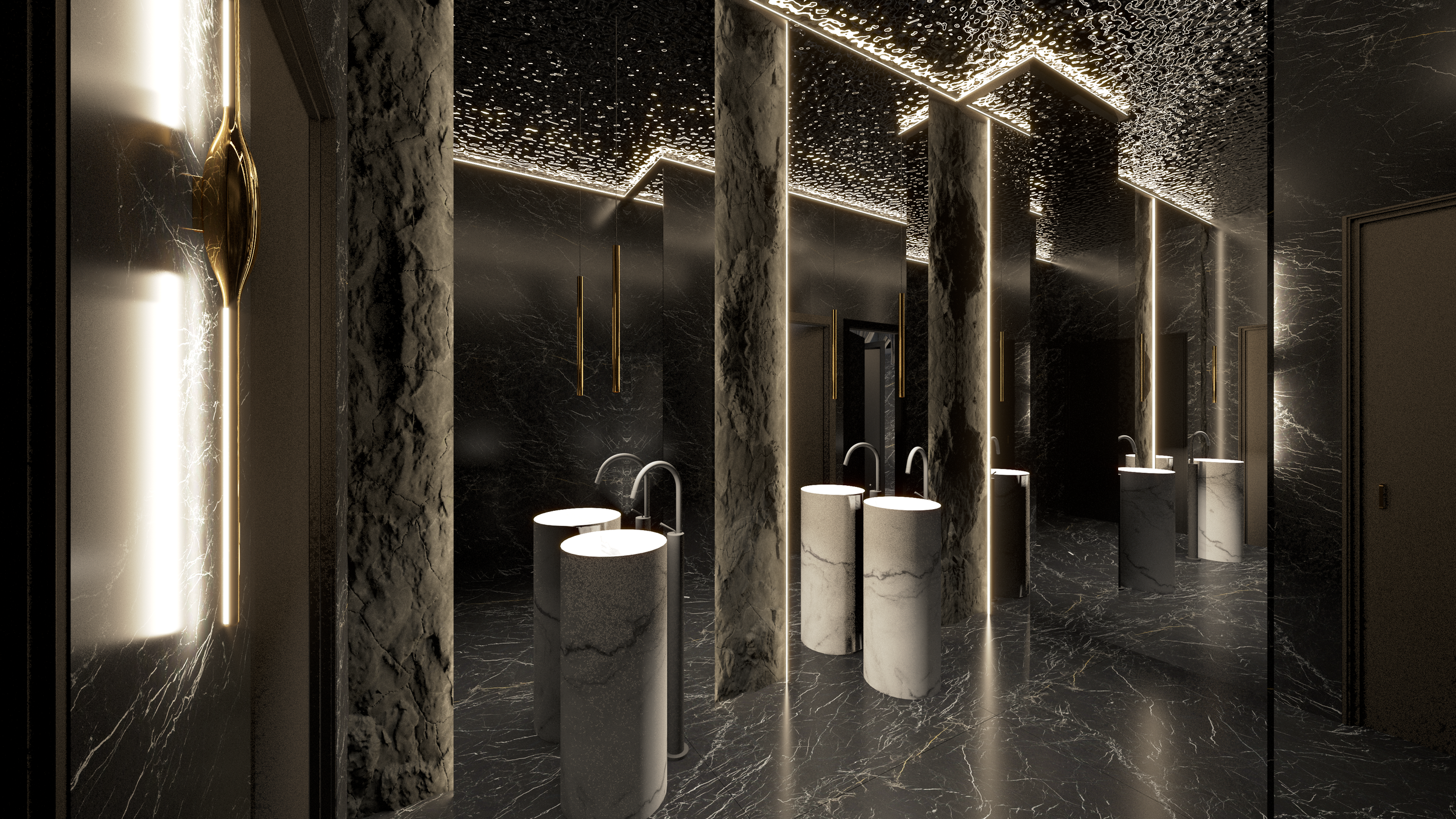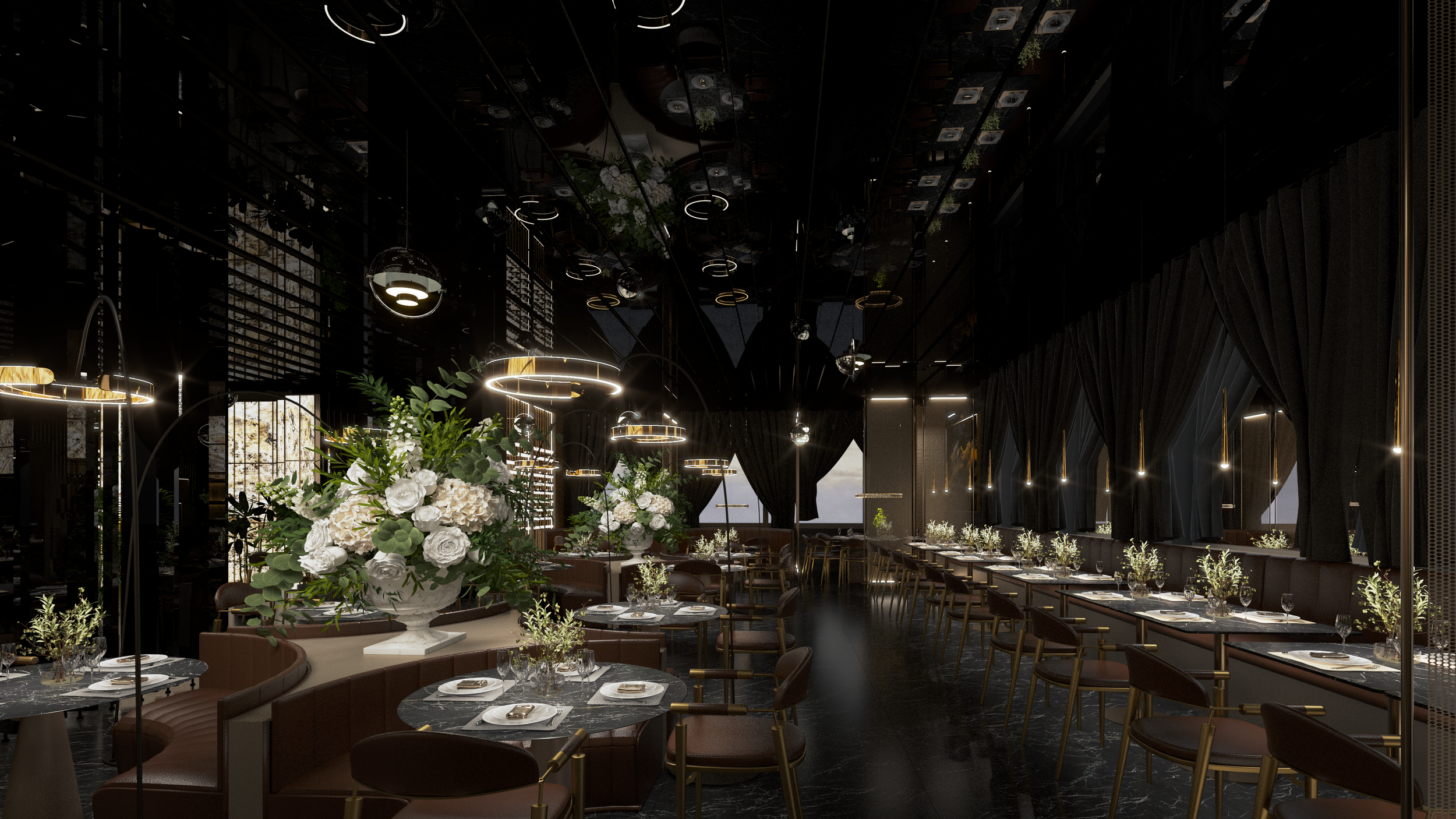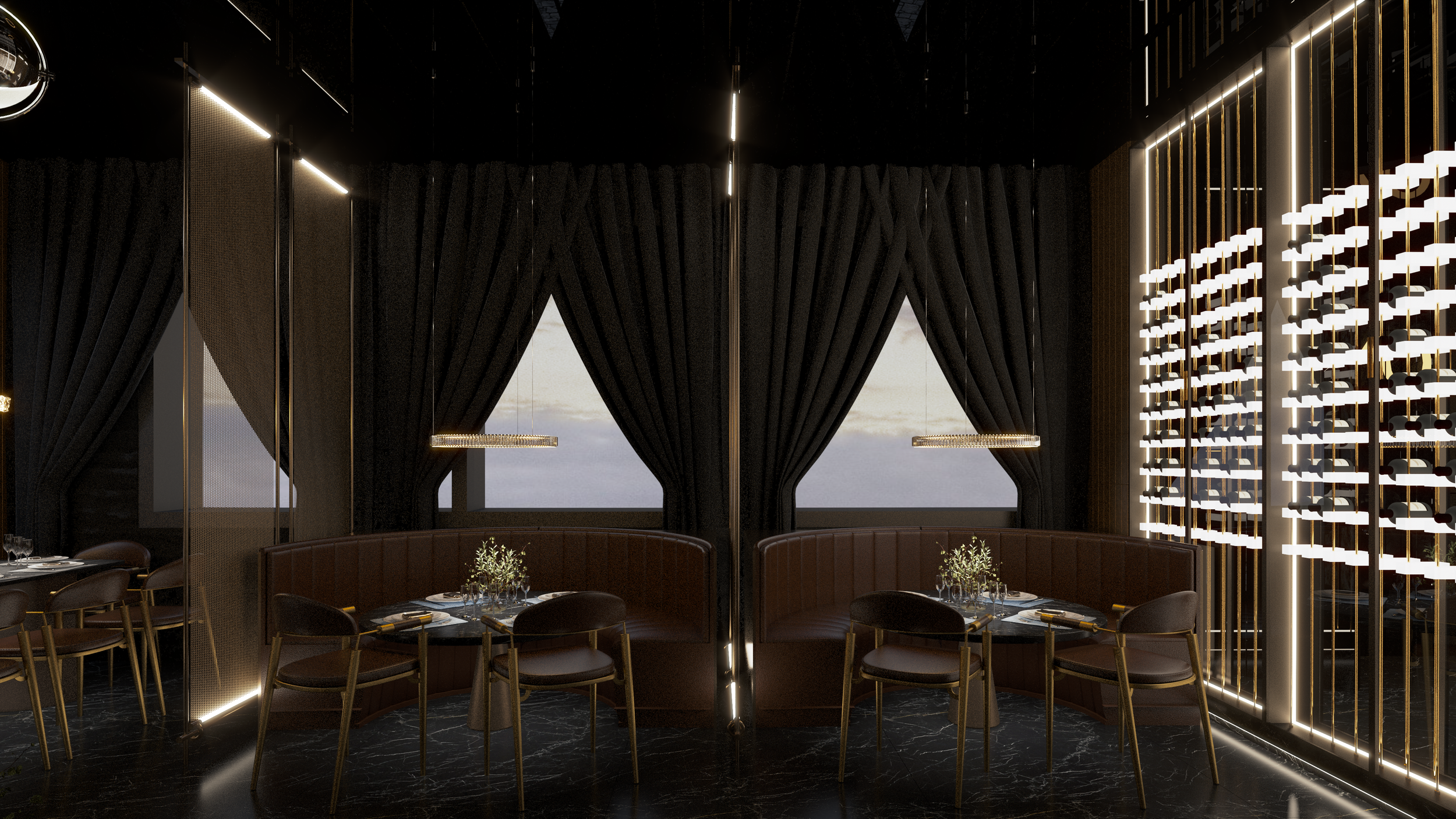 Questo ristorante buffet di sushi di alta gamma, situato nella città turistica costiera di Comacchio in Italia, si trova vicino al principale nodo di trasporto che collega le città vicine, circondato da meravigliose praterie costiere. Il cliente ha immaginato un palazzo a specchio su questo pittoresco prato, il cui design unico brilla sotto il sole, attirando ospiti da tutte le direzioni. Il design interno del ristorante utilizza metalli e specchi, completati da decorazioni dorate e materiali in pietra traslucida, creando un ambiente squisito ed elegante. Qui, offriamo una cucina raffinata e moderna che mescola elementi dell'Est e dell'Ovest, fornendo un luogo dove i commensali possono godere di un doppio banchetto di sapori e sensazioni visive